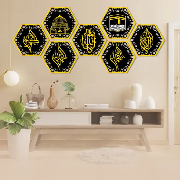 Apne ghar ki sab se bari deewar ko aik muqaddas shahkar mein badal dein. Hamara Set of 7 Khana Kaba Gumbid e Khizra Calligraphy aik exclusive 3D collection hai jo dunya ki sab se pyari jagahon aur kalimat ka haseen imtizaj hai. Is set mein Khana Kaaba aur Gumbad-e-Khizra ke central pieces ke sath-sath deegar muqaddas calligraphy shamil hai, jo aapke lounge ya guest room ko aik royal Islamic gallery ka look deti hai.