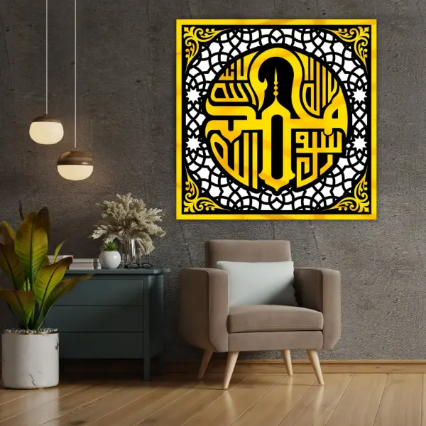 High-Gloss Mirror Acrylic: Calligraphy ke alfaz ko imported shiny mirror acrylic se tarasha gaya hai jo roshni mein chamakta hai aur deewar par aik mehanga look deta hai.