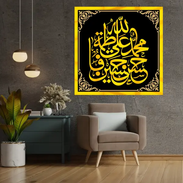 High-Gloss Mirror Acrylic: Namon ki calligraphy ko imported shiny acrylic se tarasha gaya hai jo roshni mein chamakta hai aur deewar par aik royal look deta hai.