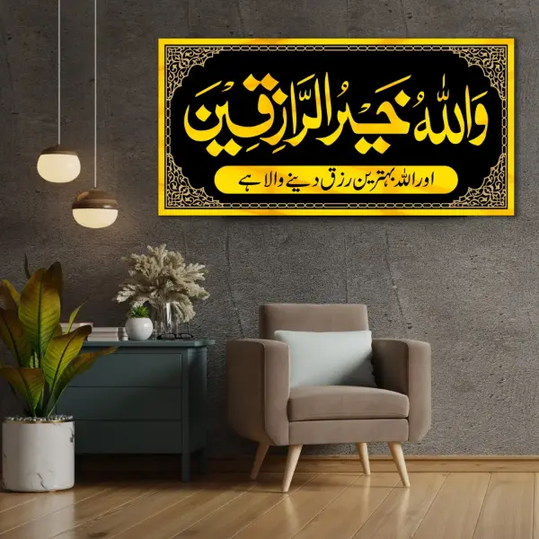 Attract Blessings (Barakah): Wallah Ho Khair Ur Razeqeen Premium Islamic Calligraphy Wall Art ghar aur daftar mein rizq ki barkat ka aik haseen zariya hai.